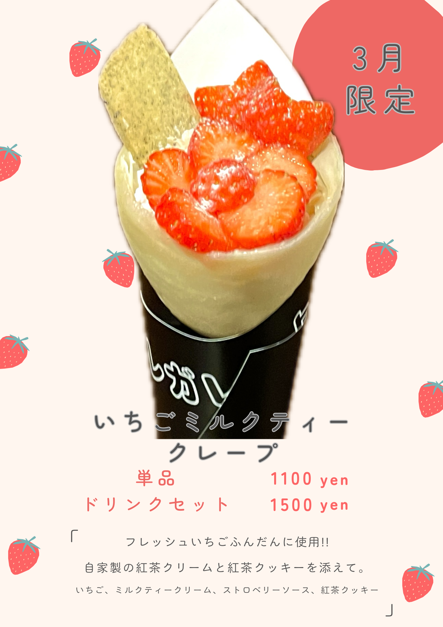 【3月限定!!いちごミルクティークレープ】 2026 3/14 NEWS 2026年3月14日 フレッシュいちごをふんだんに使用した期間限定クレープ。 自家製の紅茶クリームと丁寧に焼き上げた紅茶クッキーがいちごと相性抜群です。 NEWS 旭川クレープ よかったらシェアしてね! URLをコピーしました! URLをコピーしました! 【秋の味覚!!10月限定】モンブランクレープ販売開始!! この記事を書いた人 collegarest 関連記事 【平日限定!!】ドリンク2杯目半額!! 2025年9月18日 【大人気!】桃をまるごと1個使用したクレープ!! 2025年7月8日 【6月限定!!】自家製レモンクレープ 2025年5月30日 12月のクレープと年内営業予定日 2024年12月14日 10月の営業予定日と10月からのクレープ 2024年9月28日 店鋪営業日変更のお知らせ 2024年9月13日 7月の店舗臨時休業のお知らせ 2024年7月10日 今日から発売開始! 2024年7月3日 コメント コメントする コメントをキャンセルコメント ※ 名前 ※ メール ※ サイト 次回のコメントで使用するためブラウザーに自分の名前、メールアドレス、サイトを保存する。 Δ